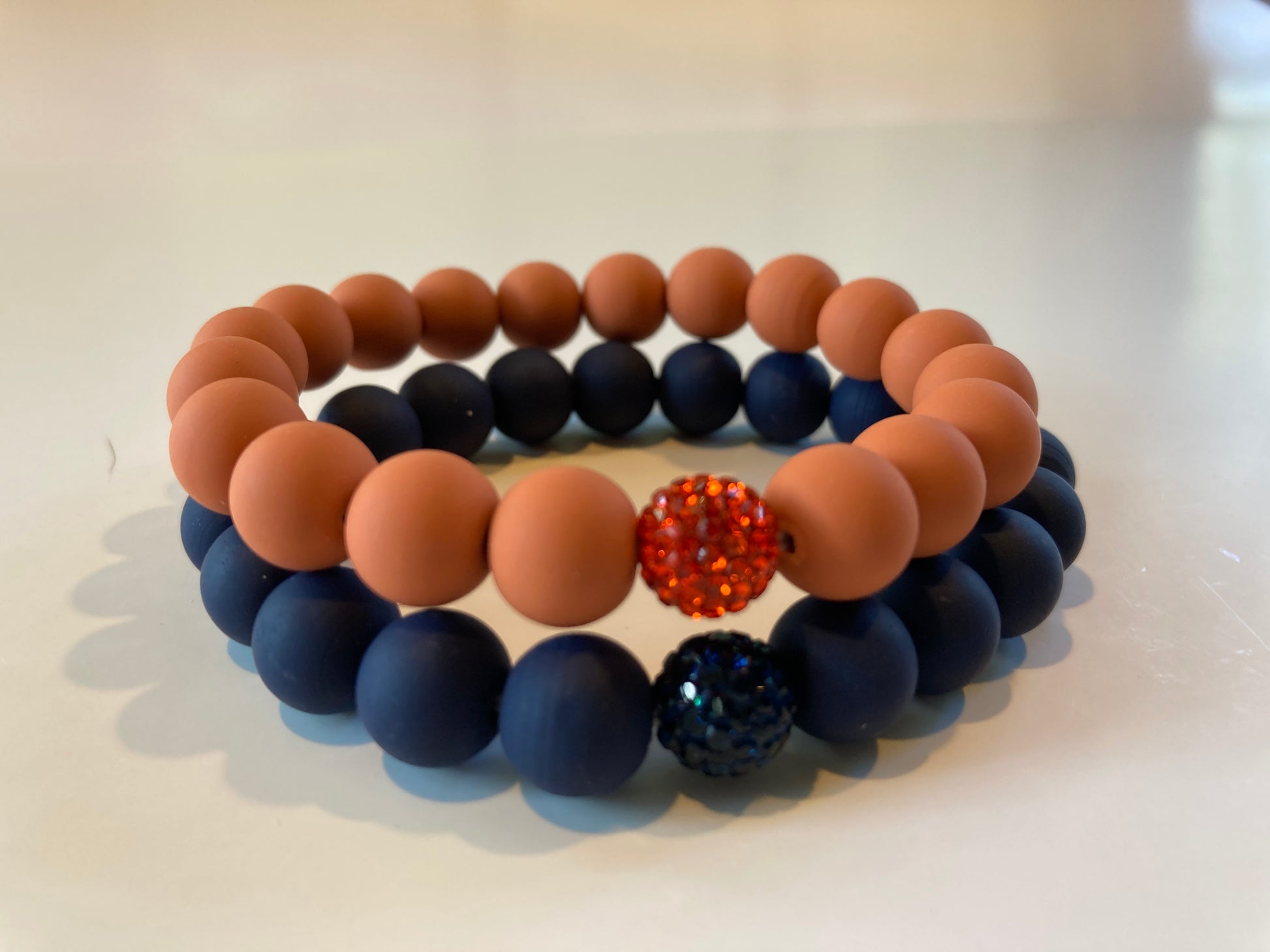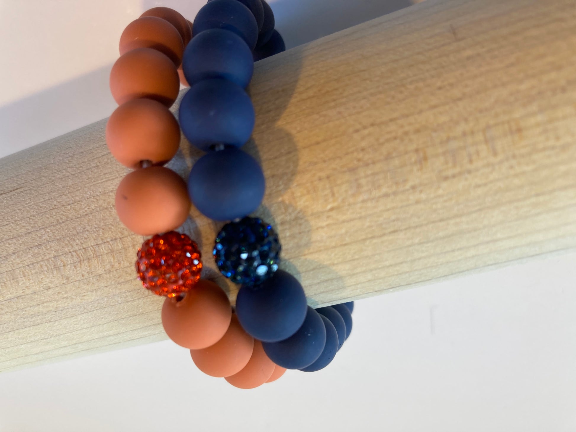 Set of muted orange and blue bracelets with sparkling focal stone. Elastic style fits any size wrist. Limited quantity. $20.00 a set (one orange and one blue)